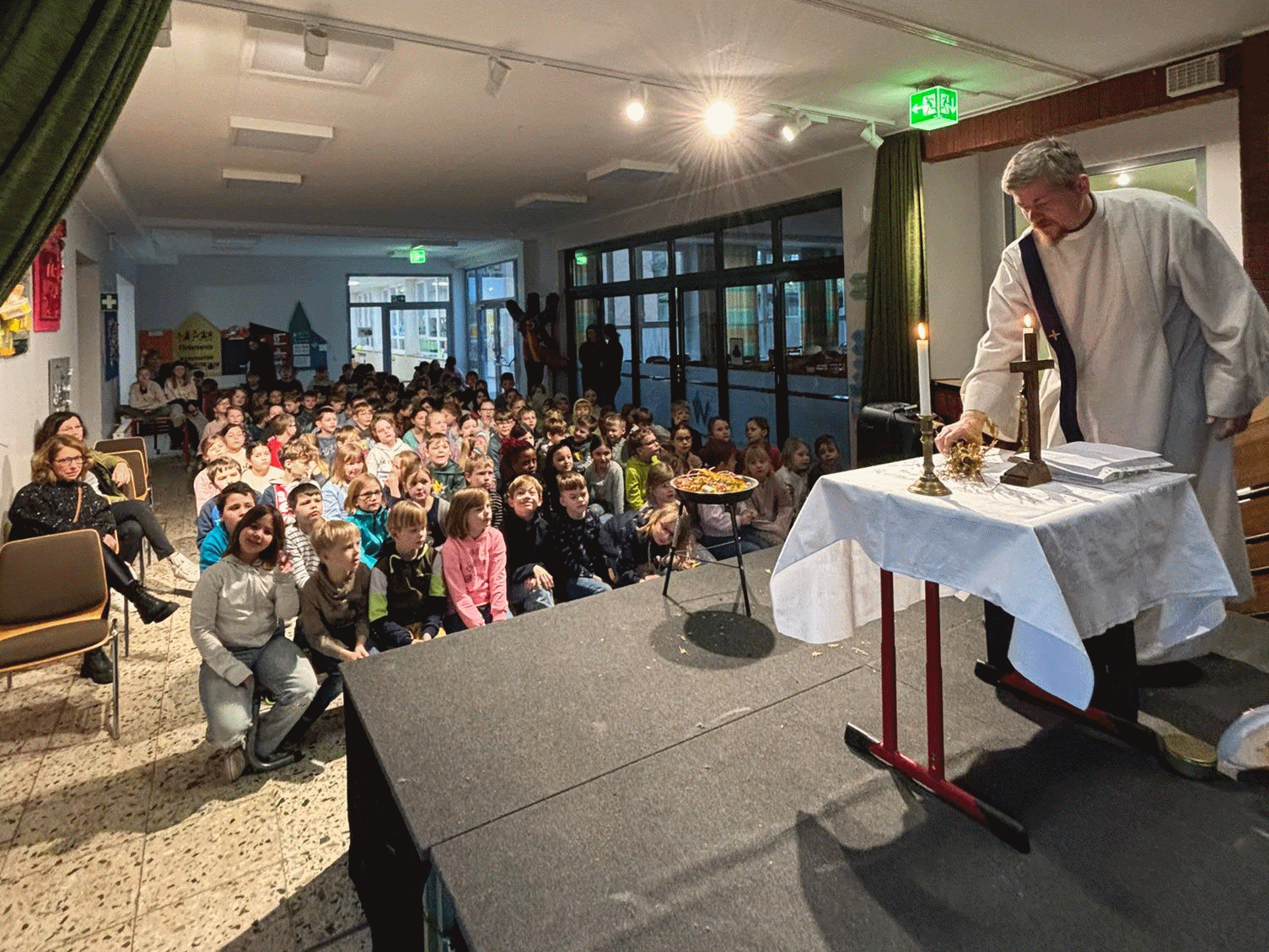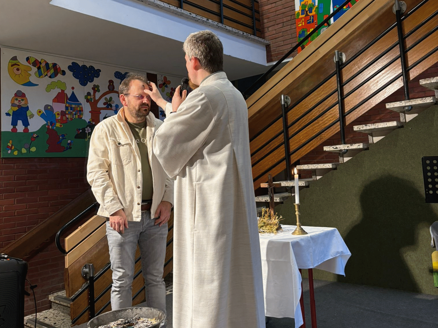 Zum Beginn der 40-tägigen Fastenzeit der christlichen Glaubensgemeinschaften findet der wöchentliche Mittwochs-Gottesdienst unserer Schule seit einigen Jahren in der Aula der Wichern-Schule klassenübergreifend für die Jahrgänge 2-4 statt. Auch in diesem Jahr wurden Luftschlangen als Symbol für die vorangegangene Karnevalszeit sowie Zweige vom immergrünen Lebensbaum verbrannt. Aus der entstandenen Asche konnten sich interessierte Kinder und Erwachsene das traditionelle Aschekreuz der katholischen Kirche auf die Stirn malen lassen - ein Angebot, das zahlreich angenommen wurde.
