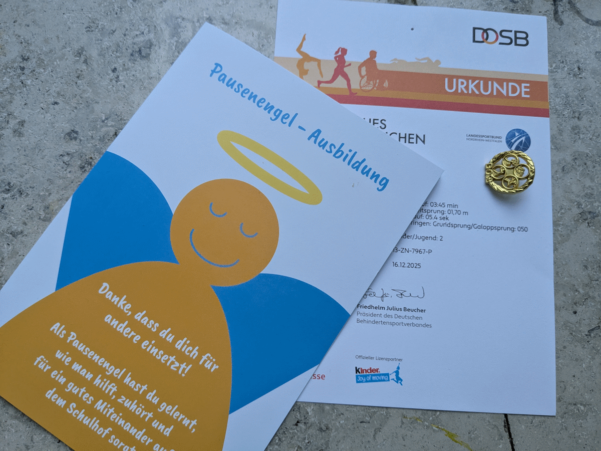 Neben einer Reihe karnevalistischer und lustiger Lieder gab es zudem Urkunden und Ehrennadeln für Schüler:innen, die das goldene Sportabzeichen erlangt haben, sowie einen Flyer als Anerkennung für die Pausenengel aus den vierten Klassen. Auf diesem vom Förderverein finanzieren Info-Heftchen stehen alle erarbeiteten Strategien zum Helfen und Unterstützen bei Konflikten, die in der Pausenengel-AG erarbeitet wurden und die nun in den Pausen ergänzend zu den erwachsenen Aufsichtspersonen zur Anwendung kommen. Vielen Dank für eure Hilfe und vielen Dank an den Förderverein für diese kleine Aufmerksamkeit! Außerdem herzliche Glückwünsche an die erfolgreichen Sportler:innen!